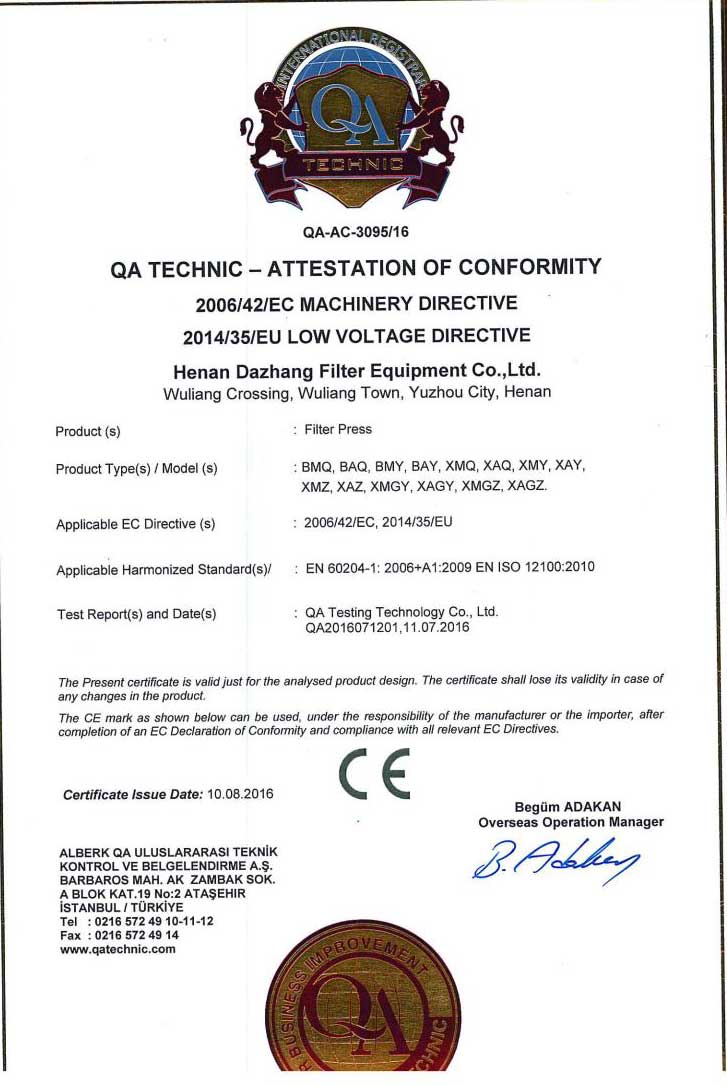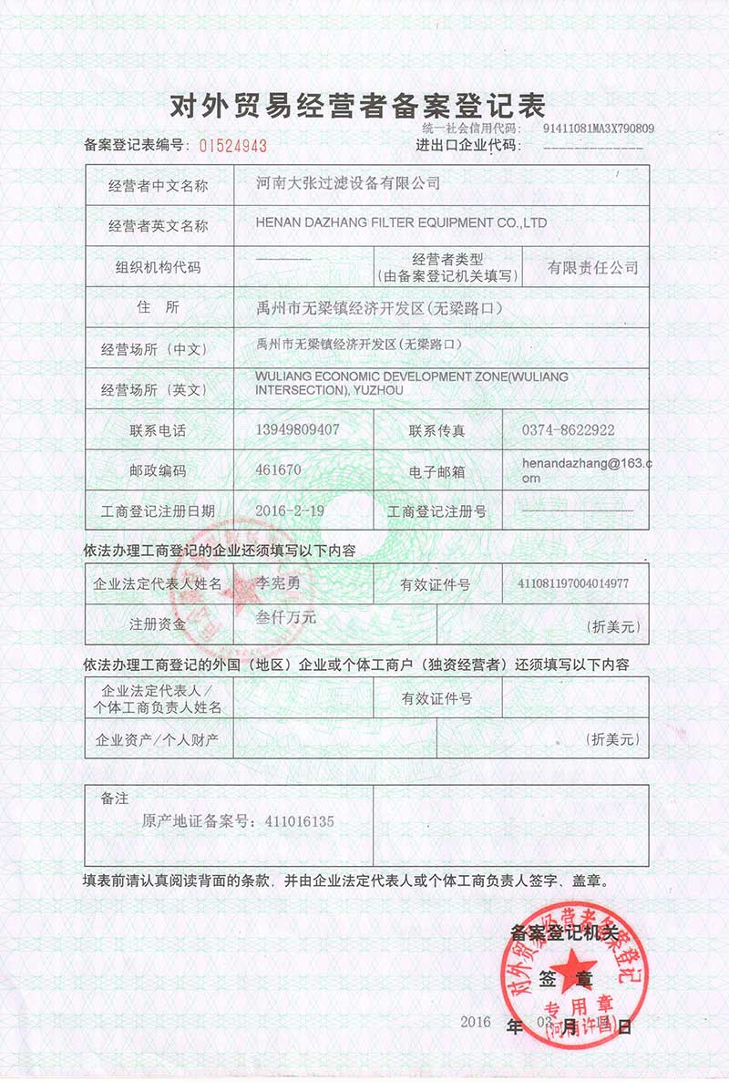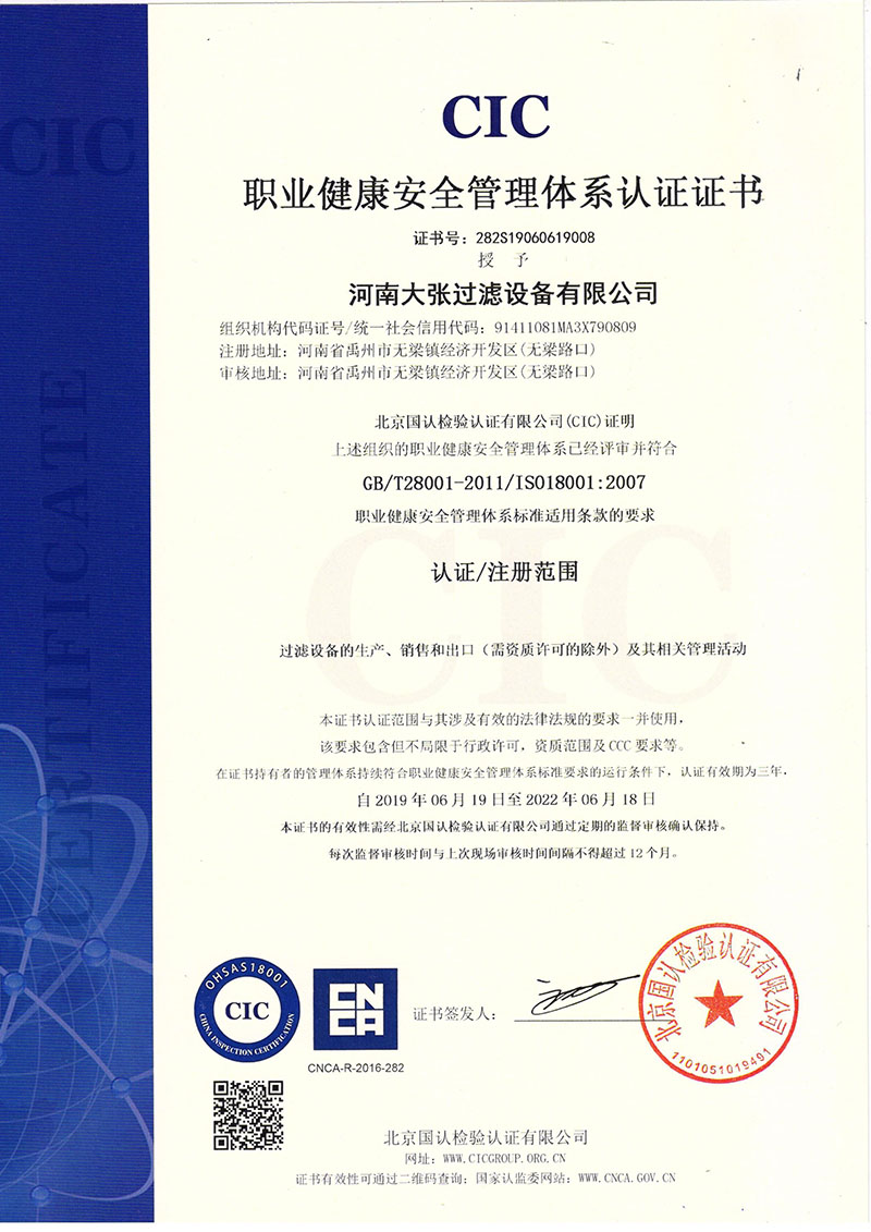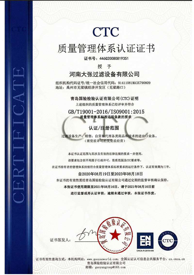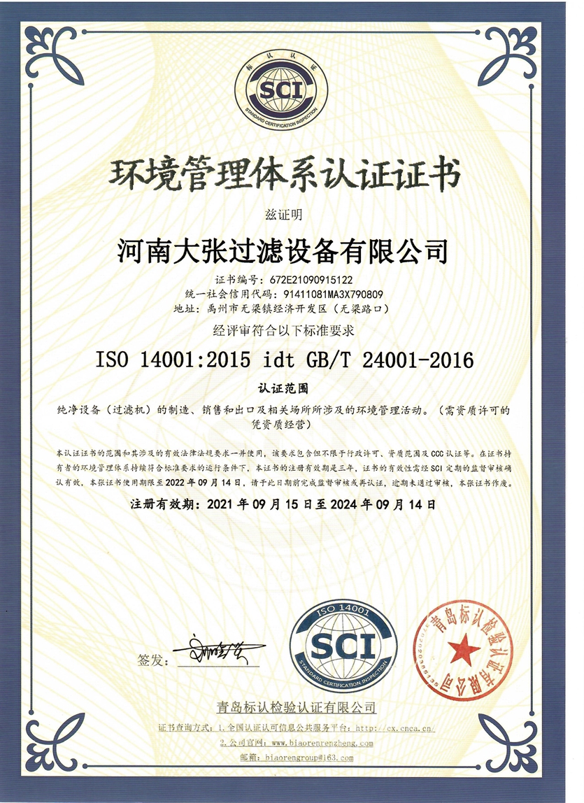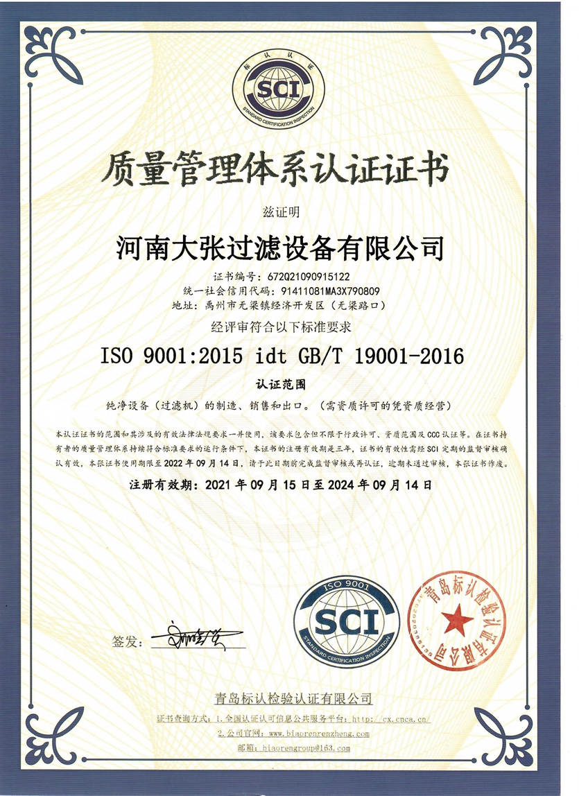 河南大張自成立以來,堅持以質量求生存、以信譽求發展,先后通過了質量管理體系、環境管理體系、職業健康安全管理體系及知識產權管理體系的認證,河南大張及關聯公司先后獲得了“國家級高新技術企業”、“國家級第三批專精特新小巨人企業”、“國家級兩化融合管理體系評定證書”“河南省技術創新示范企業”、“河南省節能減排科技創新示范企業”、“河南省優秀科技型企業”、“河南省文明誠信企業”、“河南省名牌產品”“河南省工業設計中心”“許昌市市長質量獎提名獎”等稱號。公司始終堅持創新力求發展,技術改變世界,取得令人矚目的成果。2013年研發的“免加工密封式方形聚丙烯濾板”打破了中國市場被歐洲壟斷的局面;2015年成立的“河南省新型固液分離裝備工程技術研究中心”,是河南省一家從事固液分離裝備技術開發和應用的專業機構;2017年成立的“河南省企業技術中心”證實了公司科技創新的實力和水平,2018年“高分子隔膜濾板智能自動化混料體系研發與產業化”、2019年“環保行業專用壓濾機的濾板關鍵技術研發及產業化”相繼被列入許昌市重大科技專項項目;2020年公司董事長張振利榮獲“全國優秀農民工”稱號。該年度公司被河南省科技廳認定為“河南省高分子濾板先進材料工程技術研究中心”,參與制定壓濾機方面的團標3件,修訂國家標準1件。其相關技術在國內處于優勢。2021年公司被河南省科技廳評為“河南省瞪羚企業”榮譽稱號。隨著實力的不斷增強,公司成為中國通用機械工業協會分離機械分會副理事長單位,同時為滿足市場上對壓濾機產品的需求。